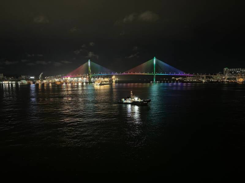 Leaving port, we went under the lighted Busan Harbor Bridge and the antenna/navigation equipment couldn't have cleared it by more than five feet. Bigger, city-sized ships (ie: Icon of the Seas) won't fit. Nice end to the day.