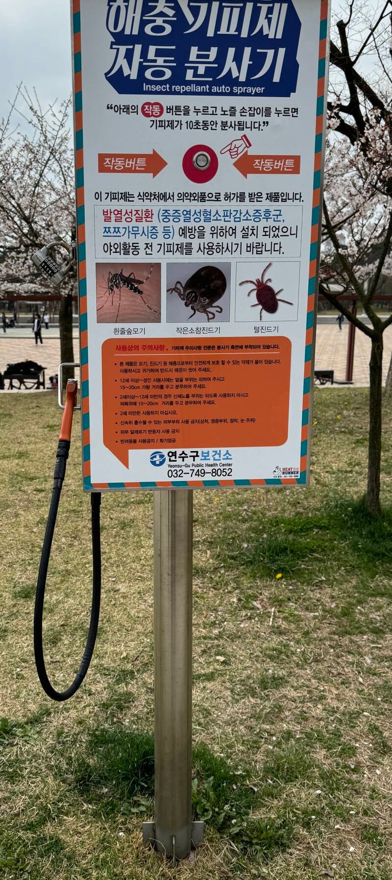 Pictures: Port sign, covering over open air part of a mall, the park district area (over a grate), a Made in Korea manhole cover, hammock hanging area, part of the rose garden, reflections in the lake, Healing Barfoot Walkway sign, Metal heart sculpture with butterflies and little girl with a cat sitting up high (no information signage about either), Sun Shelter/Small Tent instructions with Korean to English translation "Prevent crime prevention and the corruption of public morals," a public insecticide application/spraying machine, the entrance/exit park path, cherry blossoms/buds and early evening sunlight reflection with the bay bridge and a cargo ship heading out of the harbor.