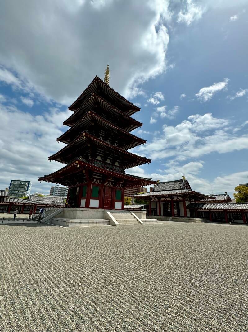Pictures: Hundreds of birds flying just above the ship's side (easier to see if you can zoom in), the Shitennoji entry torii, its two Nio guardian statues, the largest pagoda surrounded by raked gravel called samon, two young (stylish) monks and Japanese tribute area.