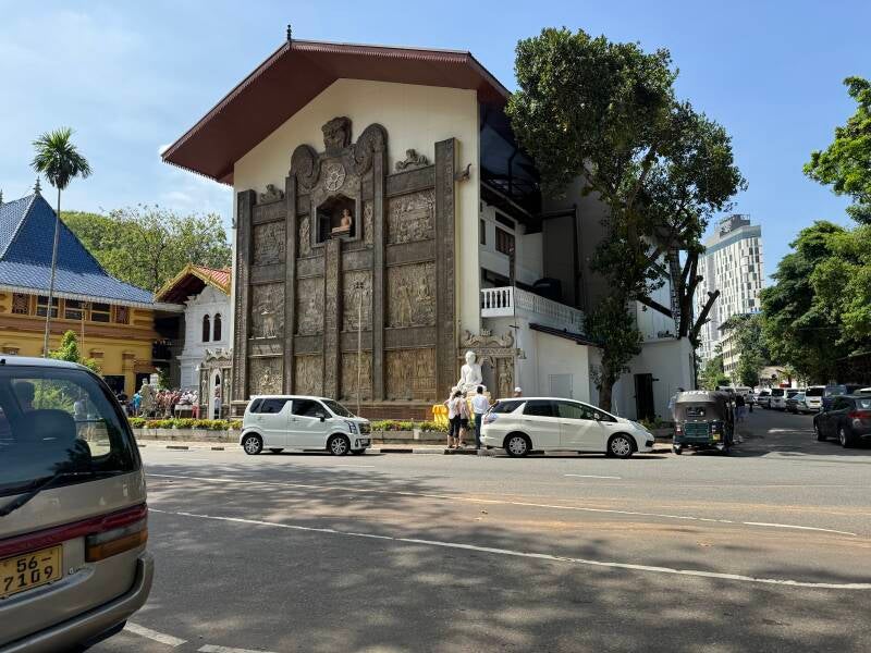 Our first scheduled stop was the Buddhist Gangaramaya Temple. You had to take off your shoes and socks to go inside, so I stayed out and walked down the street. There are tuk tuks everywhere. One owner offered to take our picture.
