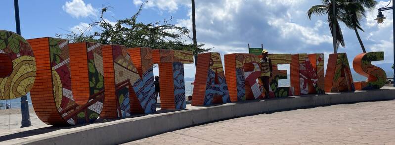 Satiated, and having had enough wandering, Roger headed back to the ship. I stayed a while longer and picked up a few items. I asked to be dropped off near the colorful Ensenada sign. The sun was going down, the wind had come up and it was almost cold.
