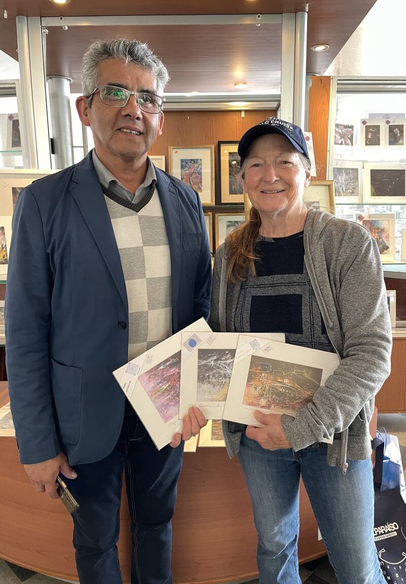 I try to find something made in the country we're visiting and here I got three small prints from the artist who actually painted the originals. My three (not those I'm holding) are impressionist views of the city. Can't get much more Made in Chile than that.