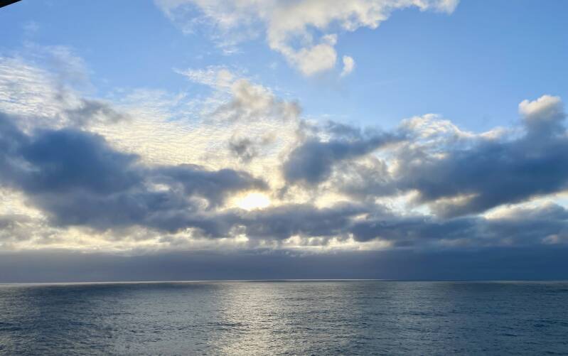 One more sea day, with water as far as can be seen in all directions. The sun came out late morning and our heavy coats were left in the cabin for the day. It became gray and overcast around 6:00pm.